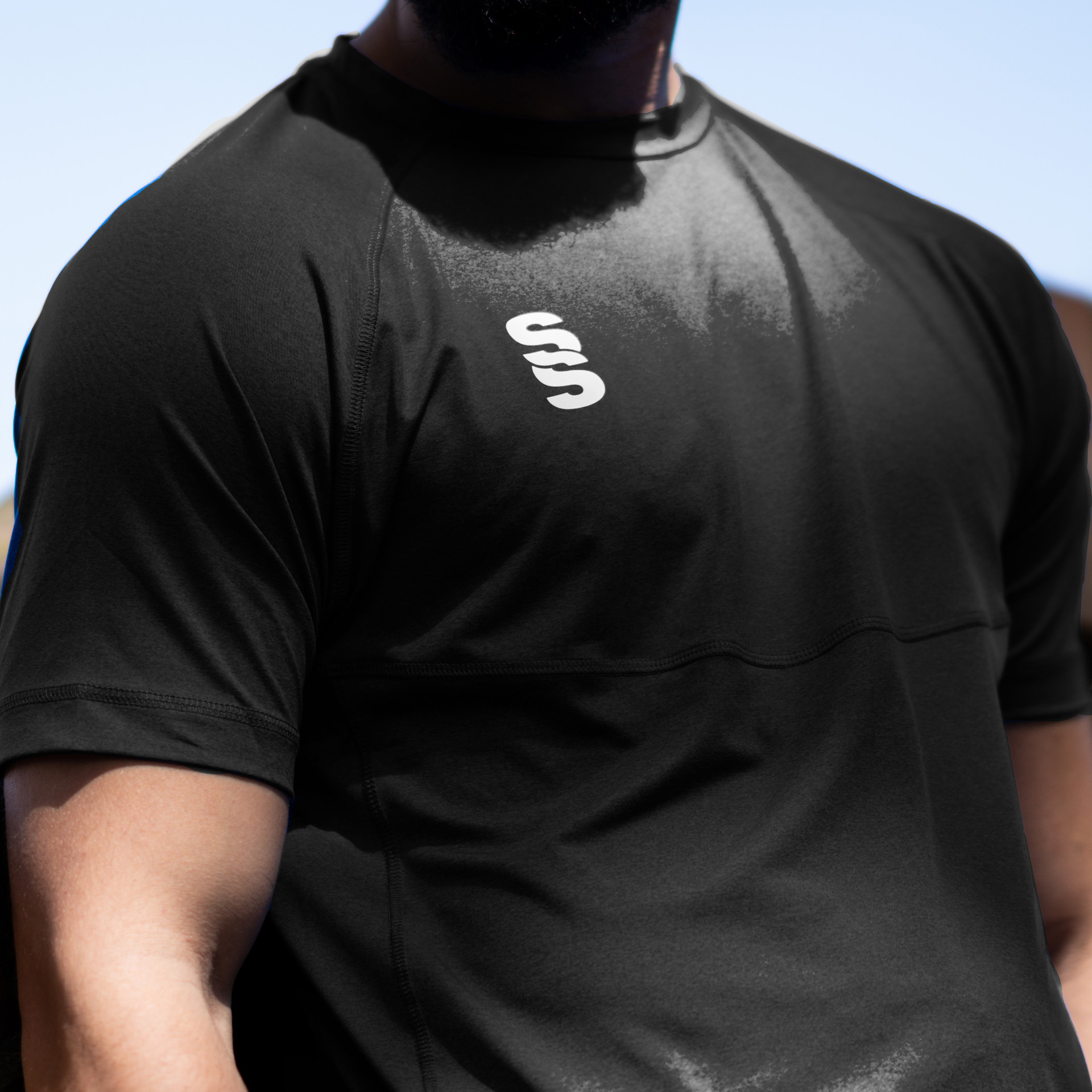 The Dual Gym T-shirt is made of high performance polyester marl fabric, with a contoured underarm side panel in breathable interlock fabric. The crew neck collar is made with modern flatlock stitching. It comes with an option for contrast colour 'dual' graphic print on both shoulders and choice of Surridge SS Logo situated on the right chest. It's super stretchy and is a regular fit, but can be worn one size down for extra fitting around a more athletic build.