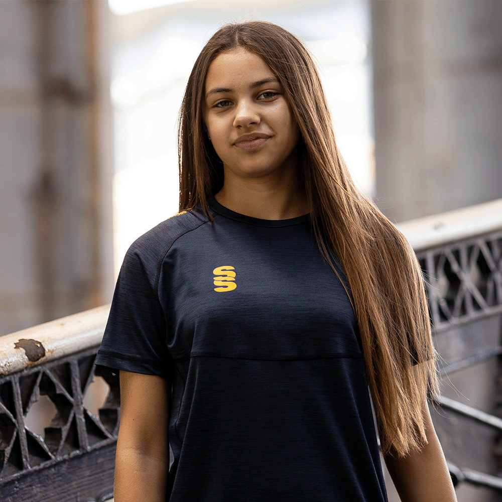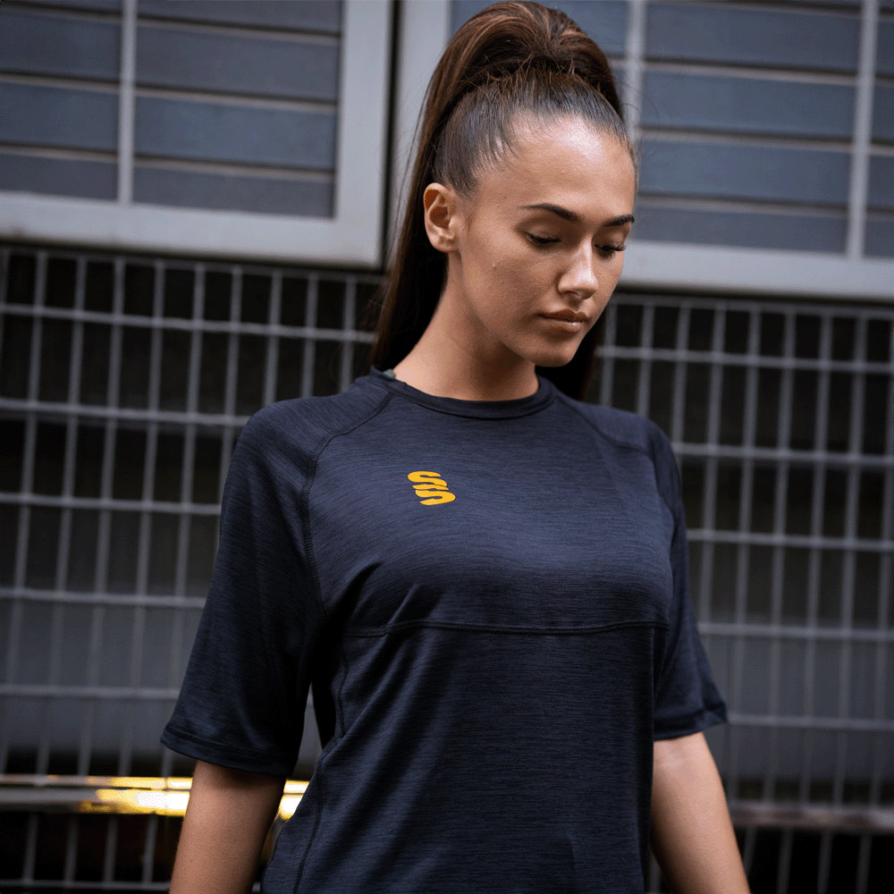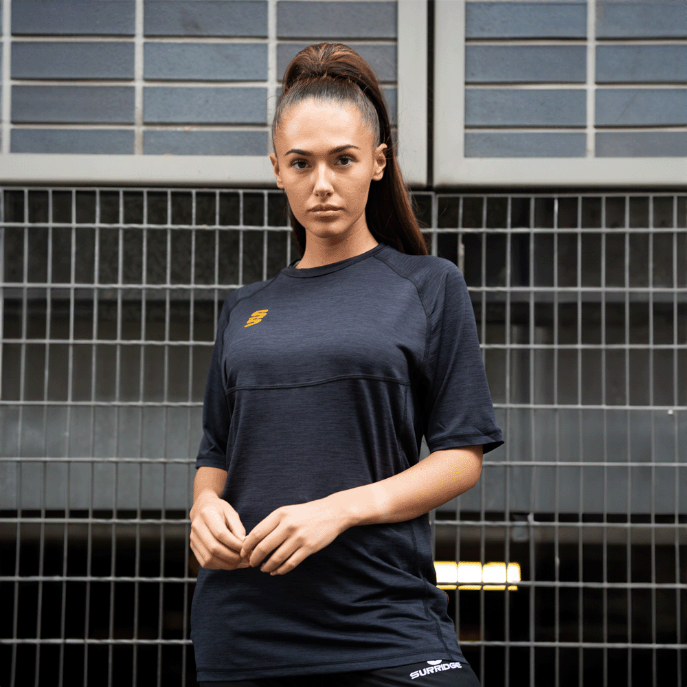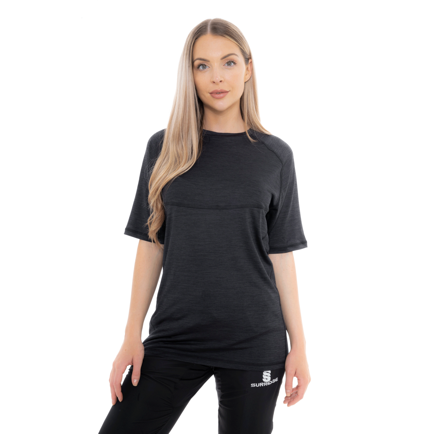 The Dual Gym T-shirt is made of high performance polyester marl fabric, with a contoured underarm side panel in breathable interlock fabric. The crew neck collar is made with modern flatlock stitching. It comes with an option for contrast colour 'dual' graphic print on both shoulders and choice of Surridge SS Logo situated on the right chest. It's super stretchy and is a regular fit, but can be worn one size down for extra fitting around a more athletic build.